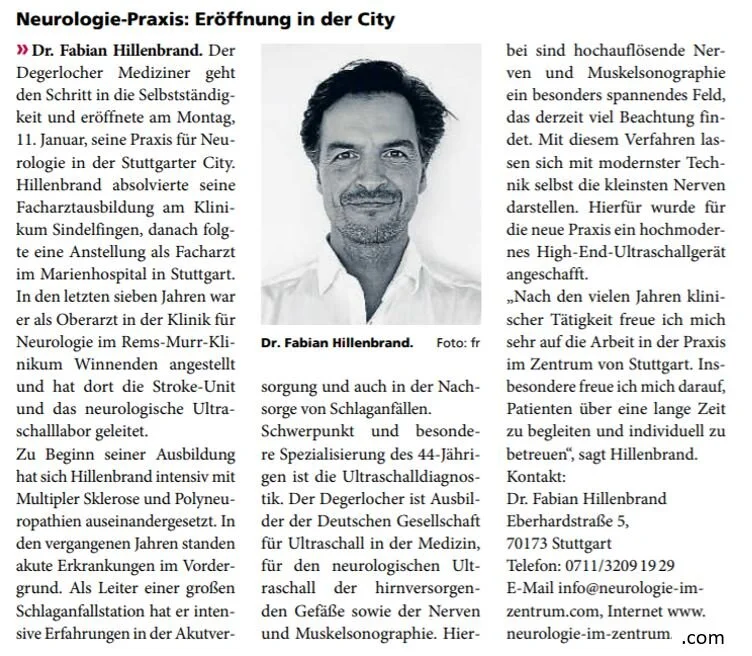 Wir freuen uns sehr über den Bericht zur Neueröffnung unserer Praxis “Neurologie im Zentrum” im Degerloch Journal vom 22. Januar 2021. Bisher haben schon zahlreiche Patienten aus Degerloch, Hoffeld, Birkach, Sonnenberg, Asemwald und Schönberg angerufen um einen Termin zu vereinbaren.